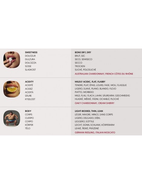 - A poszter segít megbecsülni a borokat minden szempontból, szem, orr, száj által, és a megfelelő szavakkal beszélni róluk (600 szó 6 nyelven)
