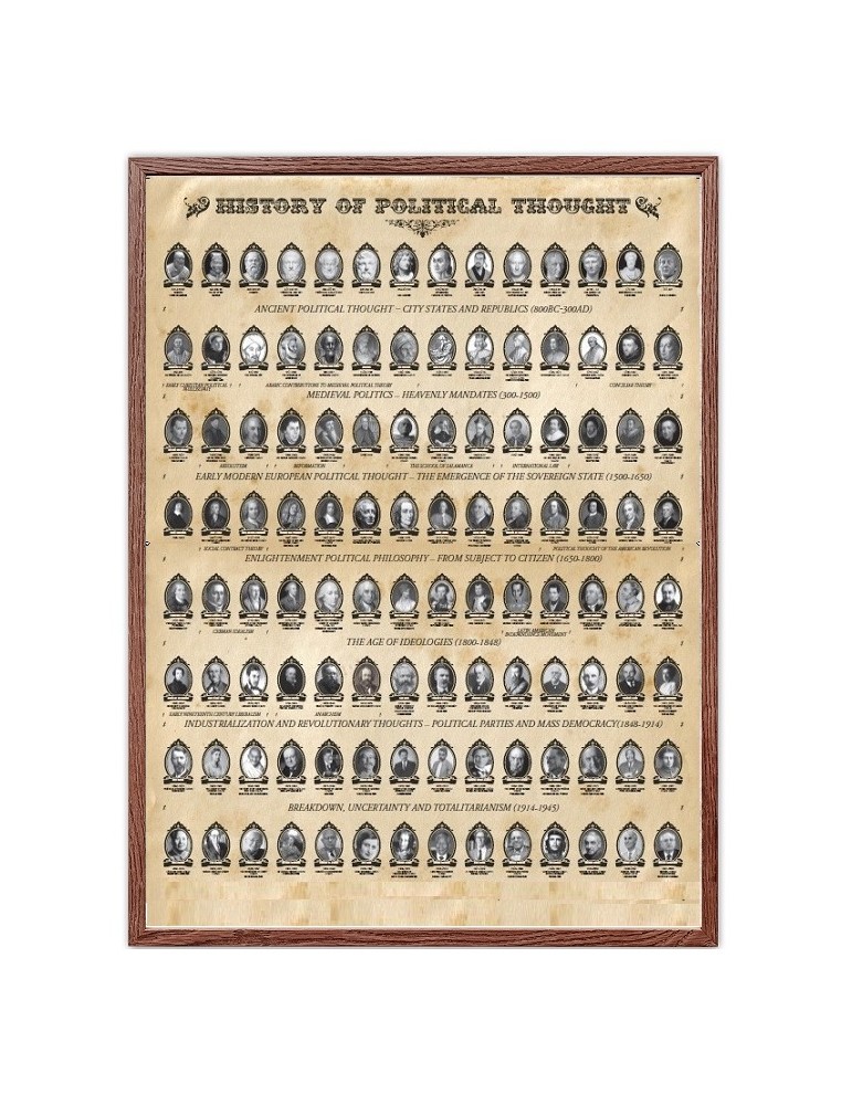 De poster is ontworpen om een algemeen chronologisch overzicht te geven en toont vertegenwoordigers van de belangrijkste tradities in de geschiedenis van het westerse politieke denken. Het omvat onder andere: