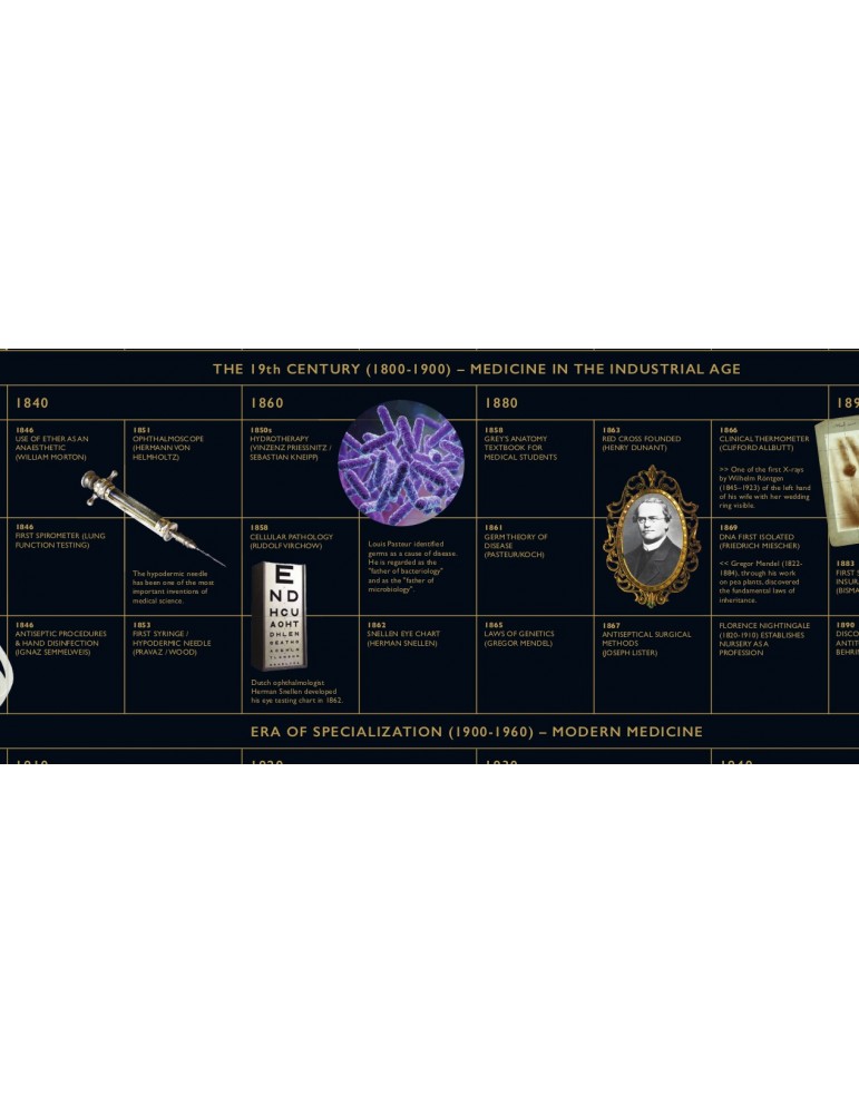 胎盘植入术、萨满教、冰人厄兹、吠陀医学、古巴比伦医学、埃德温-史密斯纸莎草、神庙和奥勒庇乌斯崇拜、中国传统医学、阴阳平衡、气血运行、针灸、希波克拉底、亚历山大学校、克劳迪乌斯-盖伦、古罗马医学、Hôtel-Dieu医院、拜占庭医学、本笃会医院。中世纪修道院医学、波斯-阿拉伯-伊斯兰医学、第一所医学院Salerno、阿维森纳、医学大全、希尔德加德-冯-宾根、鼠疫、炼金术、第一批药房、理发师、帕拉塞尔苏斯、药理学、安德烈亚斯-维萨留斯、安布罗兹-帕雷、分娩钳、产科和妇科、显微镜、安东尼-范-莱温荷克、血液循环。william harvey, 淋巴系统, thomas bartholin, 牙科, pierre fauchard, albinus, 病理学, giovanni batista morgagni, 顺势疗法, samuel hahnemann, 天花疫苗, edward jenner, 组织学, xavier bichat, morphium, friedrich serturner, 听诊器, rené laennec, 输血, james blundell, 静脉注射盐水, 麻醉。WILLIAM MULTON, 肺活量计, 消毒程序, IGNZ SEMMELWEIS, 眼镜, HERMANN VON HELMHOZ, 注射器, 水疗, VINZENZ PRESSNITZ, SEBASTIAN KUIPP, 细胞病理学, RUDOLF VIRCHOW, SNELLEN眼图, 疾病的细菌理论, LOUIS PASTUR, ROBERT KECH, 细菌学, 微生物学, 遗传学, GREGOR MENDEL, 红十字, HENRY DUNANT。防腐手术方法,Joseph Lister,Friedrich Miescher,Florence Nightingale,社会健康保险,抗毒素,Emil von Behring,病毒,X射线,Wilhelm Conrad Roentgen,阿司匹林,儿童保健,Abraham Jacobi,精神分析,Sigmund Freud,血型,Karl Landsteiner,染色体,激素和内分泌学,心电图。willem einthoven, 过敏研究, clemens von pirquet, paul ehrlich, 维生素, casimir funk, 神经传递, otto loewi, 胰岛素, 脑电图, 心导管, werner forssmann, 青霉素, alexander fleming, 维生素c, albert szent-györgyi, 抗组胺, daniel bovet, lsd, albert hofmann, 透析机, willem kolff, mammography, raul leborgne, 世界卫生组织, 化疗, 除颤器, 蛋白质氨基酸序列, Fred Sanger, 小儿麻痹症疫苗, 心肺机, 内窥镜, DNA结构, 心脏起搏器, 超声诊断, 声像图, 隐形眼镜, 髋关节置换, 心脏移植, Christiaan Barnard, 计算机断层扫描, Godfrey Houndsfield, 激光眼科手术, 磁共振成像。单克隆抗体,体外受精,DNA分析,血管内支架,腹腔镜,RNA干扰,远程手术,伟哥,人类基因组计划,多能干细胞,面部移植,免疫检查点疗法,疟疾疫苗,Car-T细胞疗法,小分子抑制剂,基因疗法,人工智能,个性化医疗